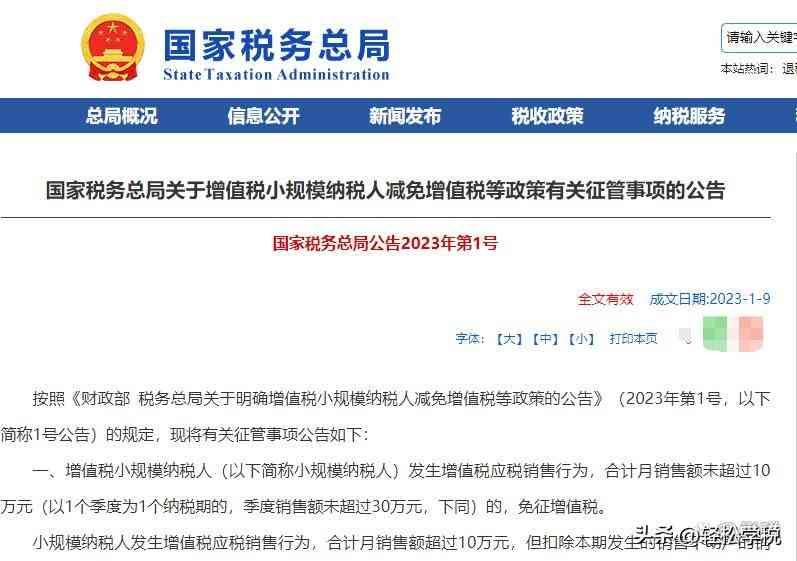在2023年,小规模纳税人月销售额不超10万(季度不超30万),免征增值税。这里的销售额的口径也没有什么变化,以所有的增值税应税销售行为合并计算销售额。