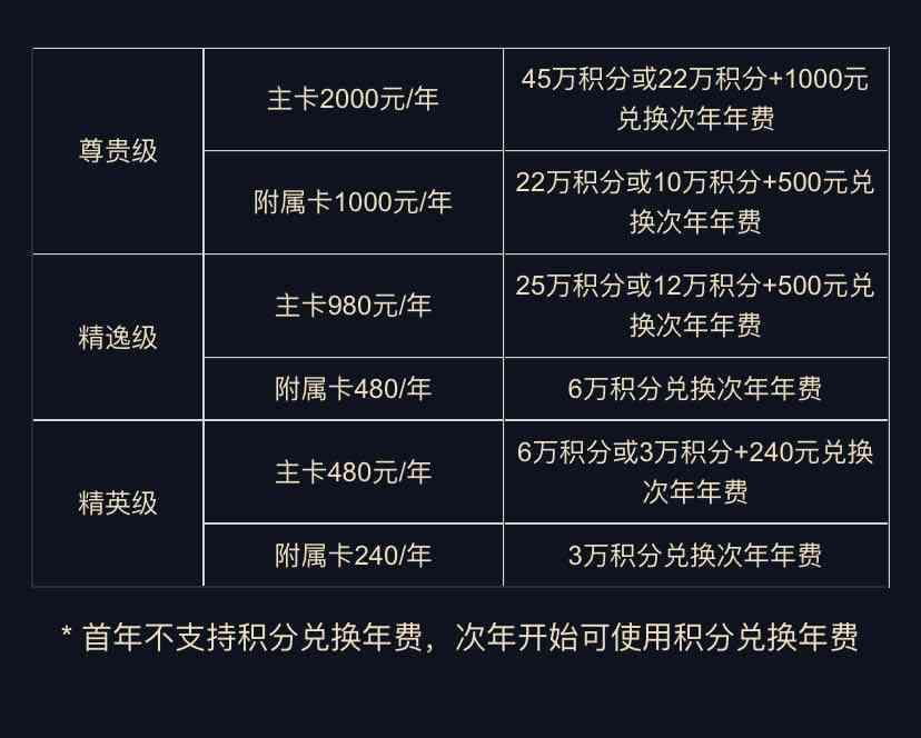 年费:精英级白金首480/年,次年6万积分或3万积分+240元兑换,精逸白金首年980/年,次年25万积分或12万+5元兑换,尊贵白金首年2/年,次年45万或22万积分+1元兑换。