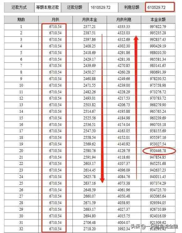 从图中我们可以看到,等额本息每个月还款金额都是固定6710.54元,每个月的利息逐步递减而本金逐月递增,也就是说我们一开始还的金额大部分都是利息。这也是为什么很多人想要提前还款的时候发现剩余本金为什么还那么多?!