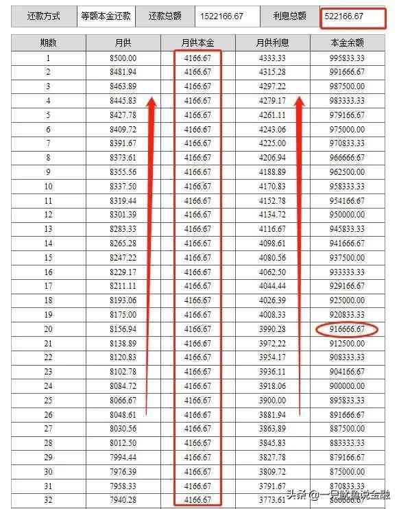 同样20年期,等额本息还款总利息610529.72元,而等额本息的总利息522166.67元,等额本息比等额本金要多88363.05元,这就是利息上的区别。