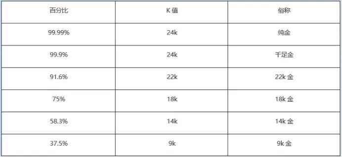 黄金根据“K值”来区分档次和价格,K值越高,代表含金量越高 ,对应不同的名称。下图是“K值”、“俗称”和黄金含量百分比的对照表,可做参考之用。档次最高的是“纯金”,金含量为99.99%,这也是现货黄金CFD所对应的黄金报价。