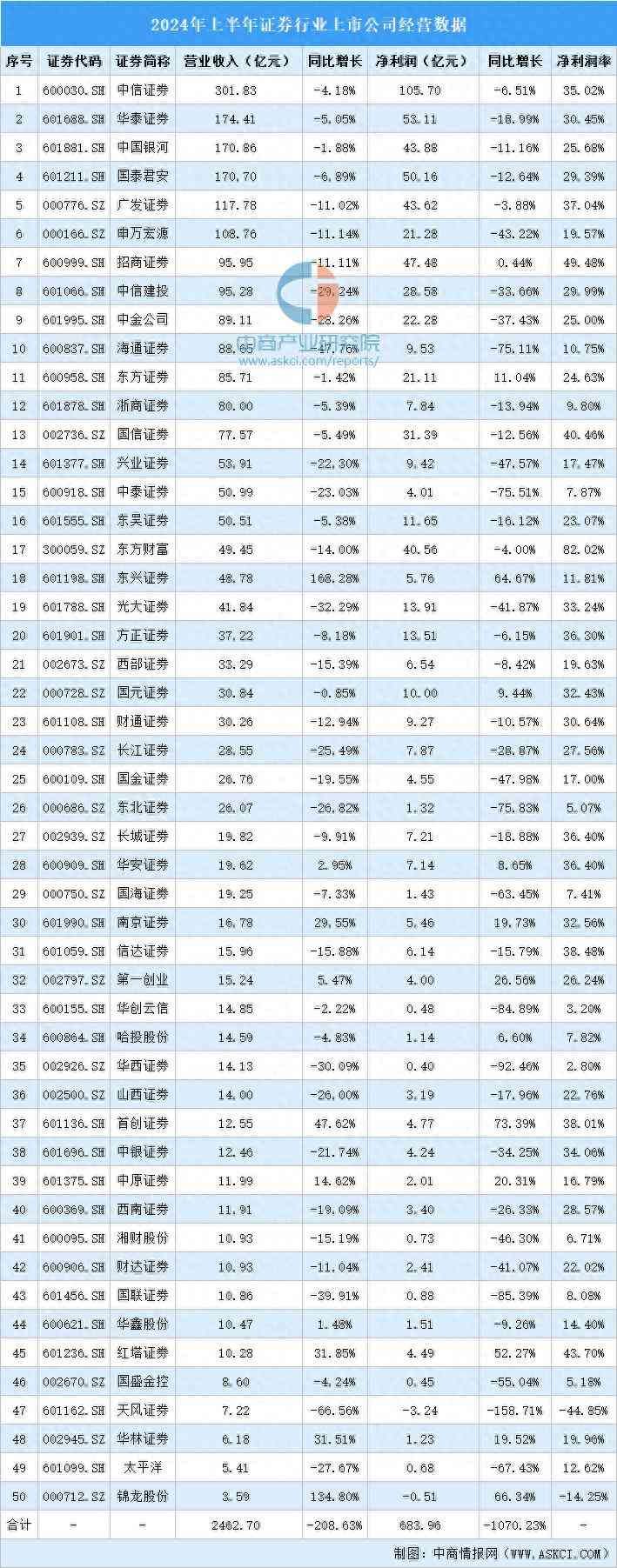中商情报网讯:2024年上半年,证券行业50家上市公司合计实现营收2462.70亿元,同比减少208.63%;合计净利润683.96亿元,同比减少1070.23%。其中,营收前十的公司分别为中信证券、华泰证券、中国银河、国泰君安、广发证券、申万宏源、招商证券、中信建投、中金公司、海通证券。