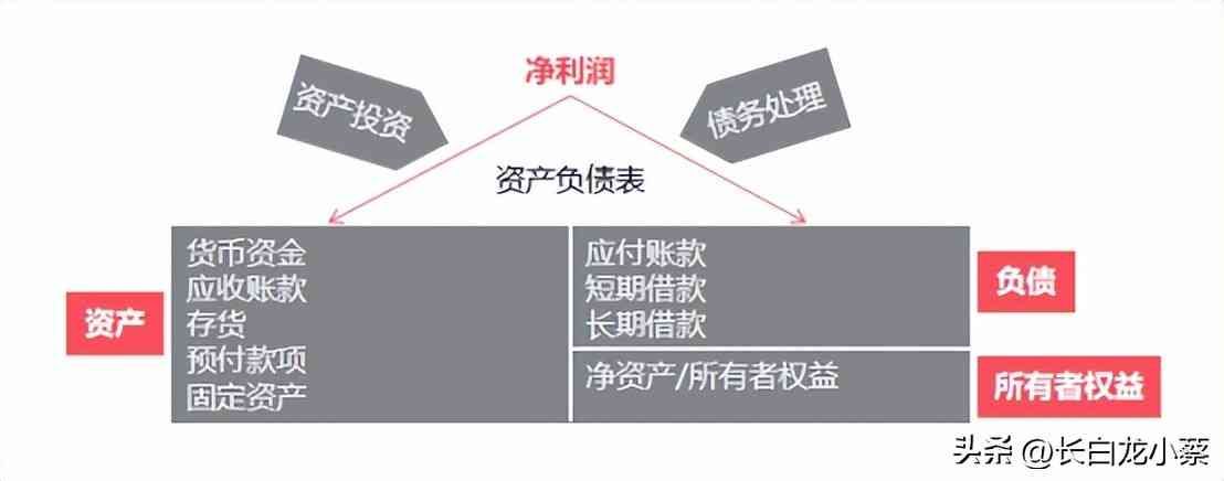 如上图所示,一般企业赚到的钱会兵分两路,一路流向资产负债表的左边,叫资产投资;一路流向右边,上半部分是债务,下半部分是所有者权益,也叫净资产。