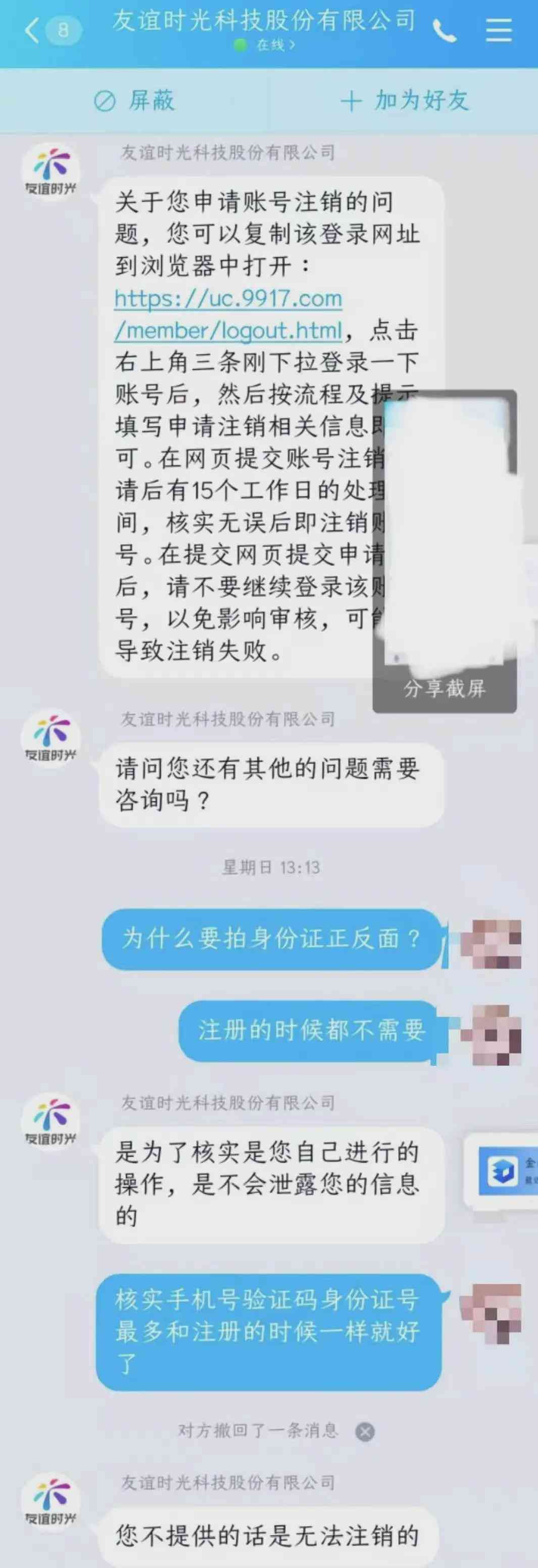 思南在QQ上找到官方客服,客服给她一个链接,里面要她提供身份证正反面照片。客服答复:“您不提供的话是无法注销的。”她找到微博上有同样经历的网友,对方用“好玩友”平台注销成功了,该平台和浮世为卿歌同属一家公司。不过,通过“好玩友”注销也要提供身份证正反面照片,还要手抄账号注销确认函并加盖手印。思南和小鱼一样,放弃挣扎了。
