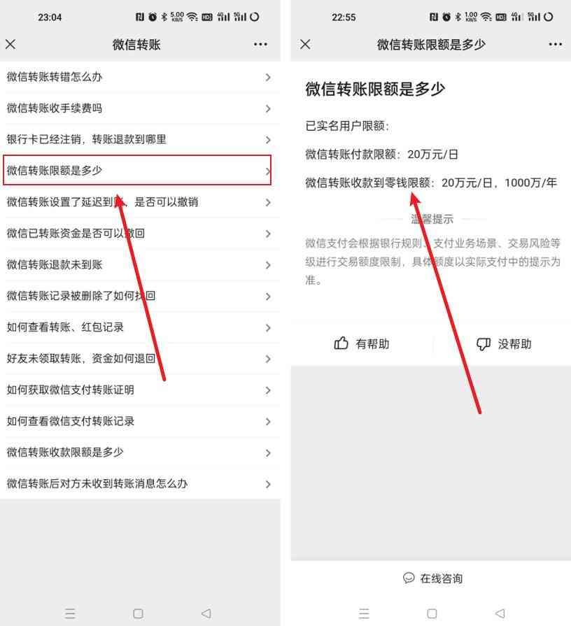 4、最后在微信转账问题中找到并点击【微信转账限额是多少】,然后就能看到正确的答案为:微信转账付款限额为20万元/日,收款到零钱限额为20万元/日,如下图所示: