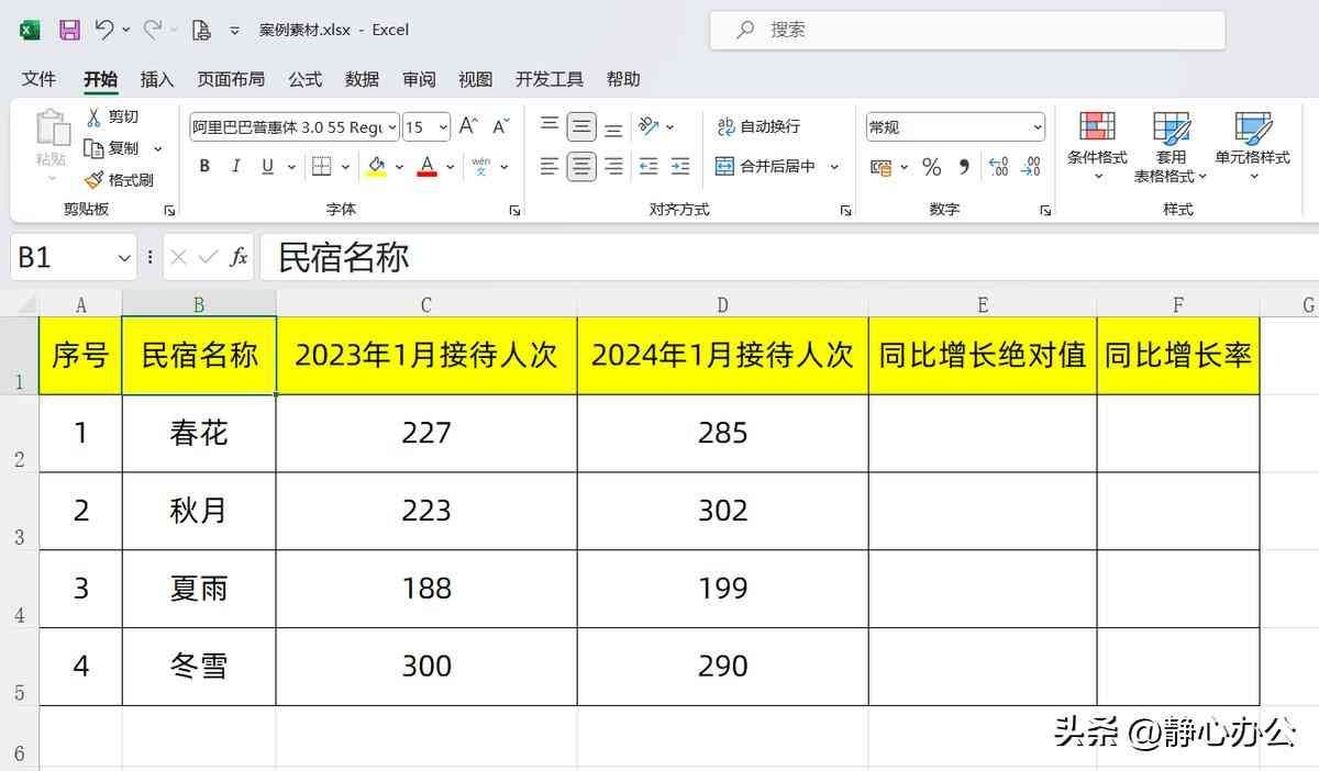 在下图工作表的E列和F列分别计算不同民宿2024年1月相对于2023年1月接待人次的同比增长绝对值、同比增长率。