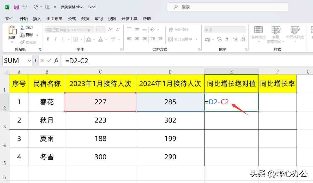 选中E2单元格,在英文状态下输入公式:=D2-C2,回车确认公式,再将公式向下填充,可得到所有民宿的同比增长绝对值。