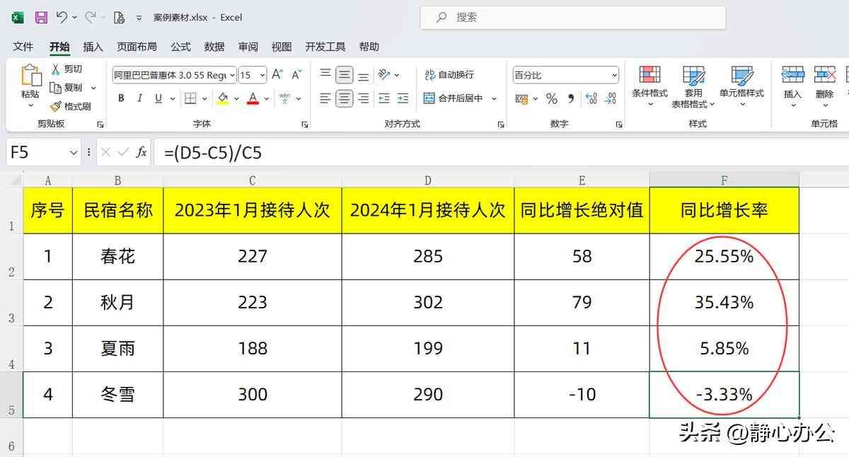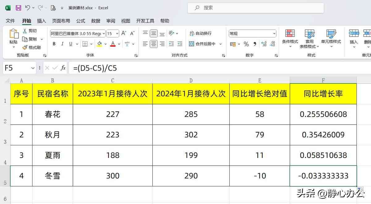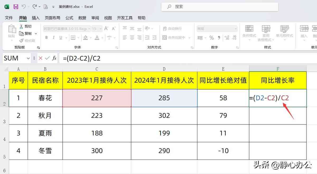 选中F2单元格,输入公式:=(D2-C2)/C2,回车确认公式,再将公式向下填充,可得到所有民宿的同比增长率。