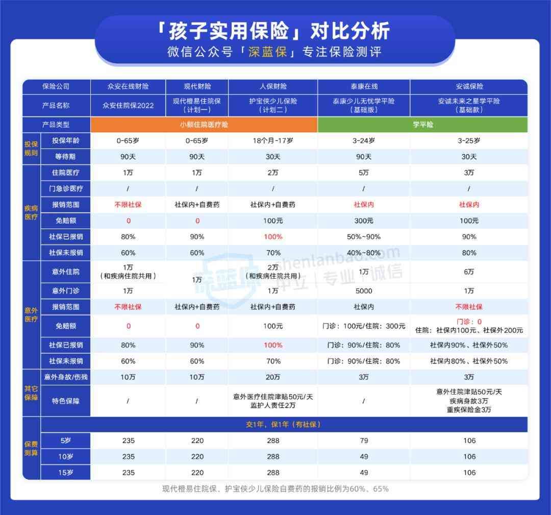 如果想要报销条件更好:可以考虑众安住院保2022,不限社保报销,并且也没有免赔额;现代橙易住院保和护宝侠报销比例更高一点,但是只能保社保内和自费药的费用。如果想要价格便宜:可以考虑泰康少儿无忧学平险和安诚未来之星学平险,前一款价格更便宜,后一款报销条件相对更好。另外,生活中除了这些高频小风险需要保障以外,大病等低频大风险更不容忽视,给孩子配齐百万医疗险和重疾险也很重要,这样保障才能更全面。