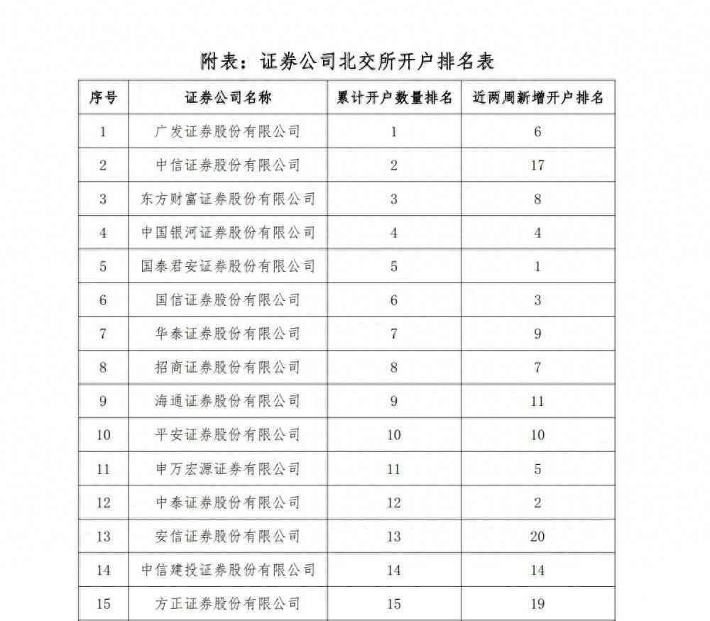 其中,10月30日至11月10日,国泰君安证券、中泰证券、国信证券新增开户数分别为19764户、15587户、13780 户,在同期证券公司北交所开户排名中位列前三名。