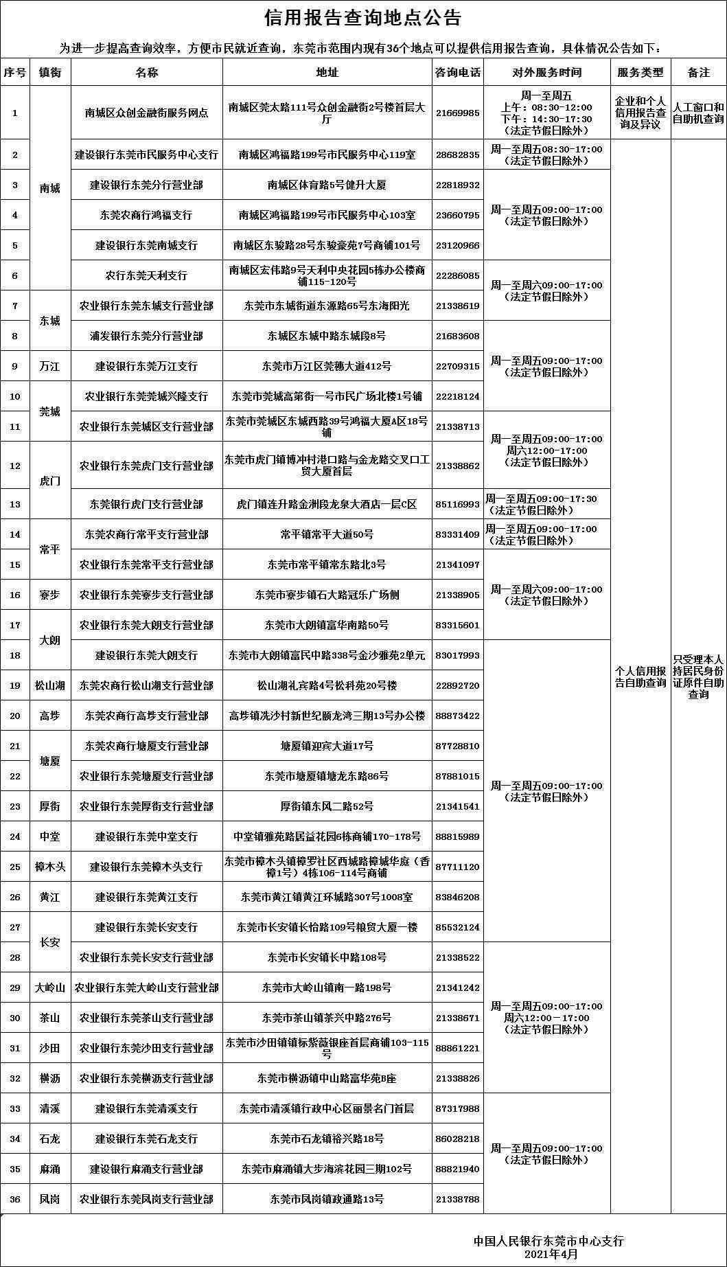 线下查询渠道有2种,分别是银行网点自助查询机查询和人民银行征信查询服务网点柜台查询。东莞目前有36个自助查询银行网点提供个人信用报告查询服务,分别分布在南城、东城、虎门、塘厦等24个镇街园区;有1个人民银行征信查询服务网点提供个人和企业信用报告查询服务,设在东莞市南城区众创金融街。
