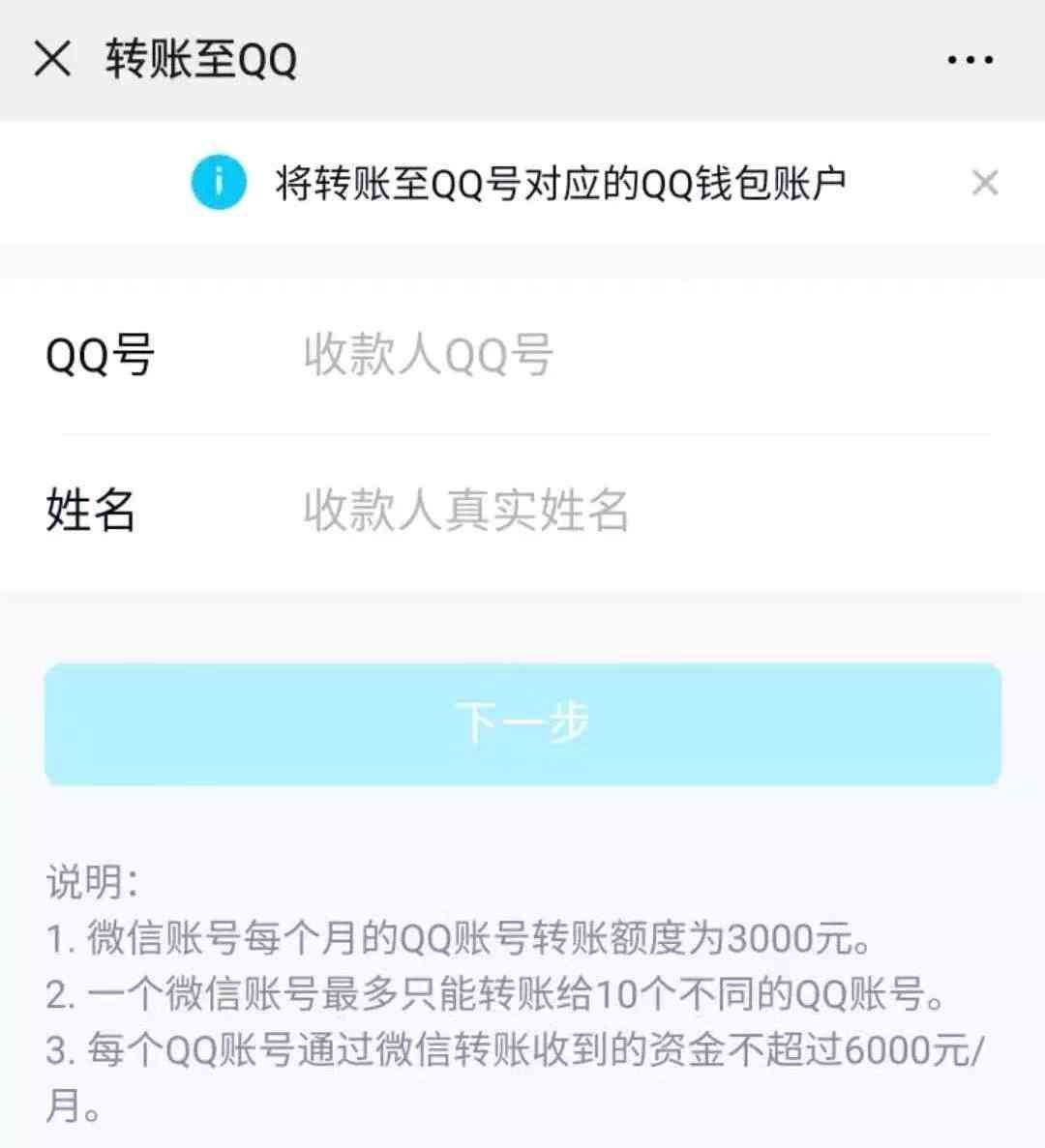 据了解,用户可在微信上关注公众号“QQ钱包官方帐号”,关注后,可点击“转账到QQ”选项进入转账页面,输入收款人的QQ号和真实姓名,二者信息一致即可转账。转账成功后,收款方可在QQ中的“QQ钱包”公众号中收到到账通知,转账金额自动进入用户钱包余额,无需手续费。