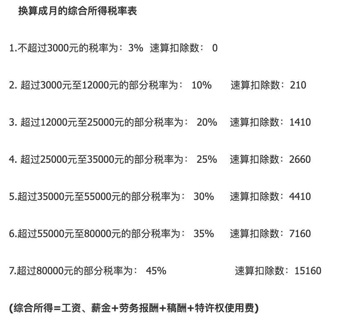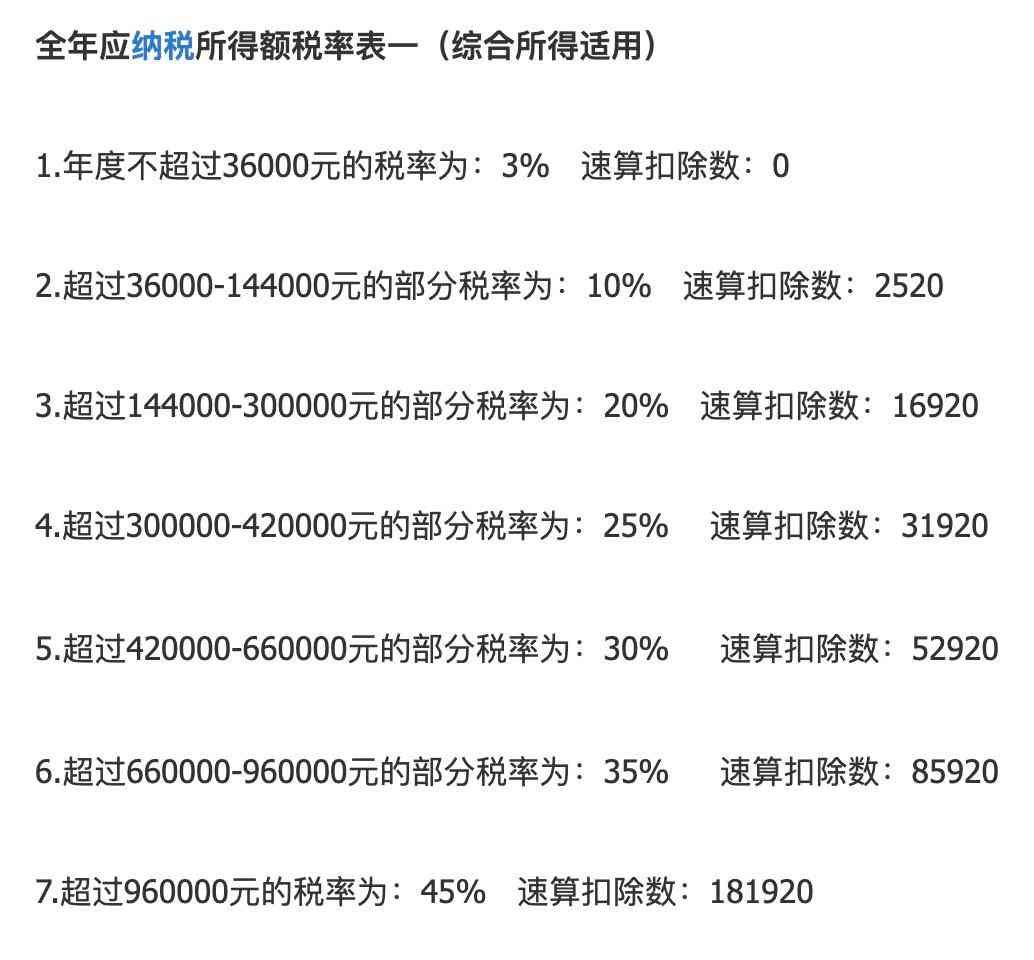 以我举例,养娃每月抵扣(1)、房贷(1)、我爸到60周岁了(2)。一个娃1,2个娃就是2,但赡养老人的抵扣跟数量无关(父母都到60了,最多也是2),房贷的话只有首套房才算。我们采用的是阶梯税率,详见下图: