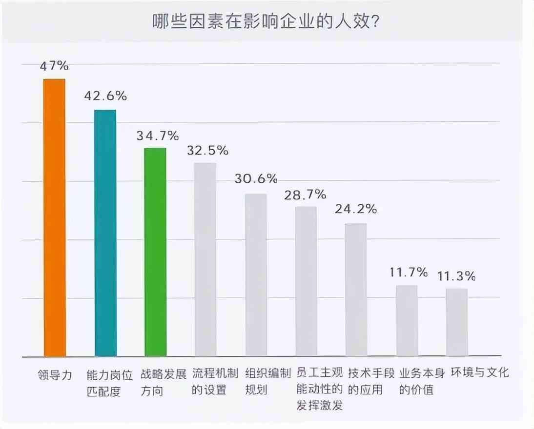 根据调研数据,我们发现影响企业人效排名前三位的因素分别为:领导和管理能力水平、能力岗位匹配度、战略发展方向。