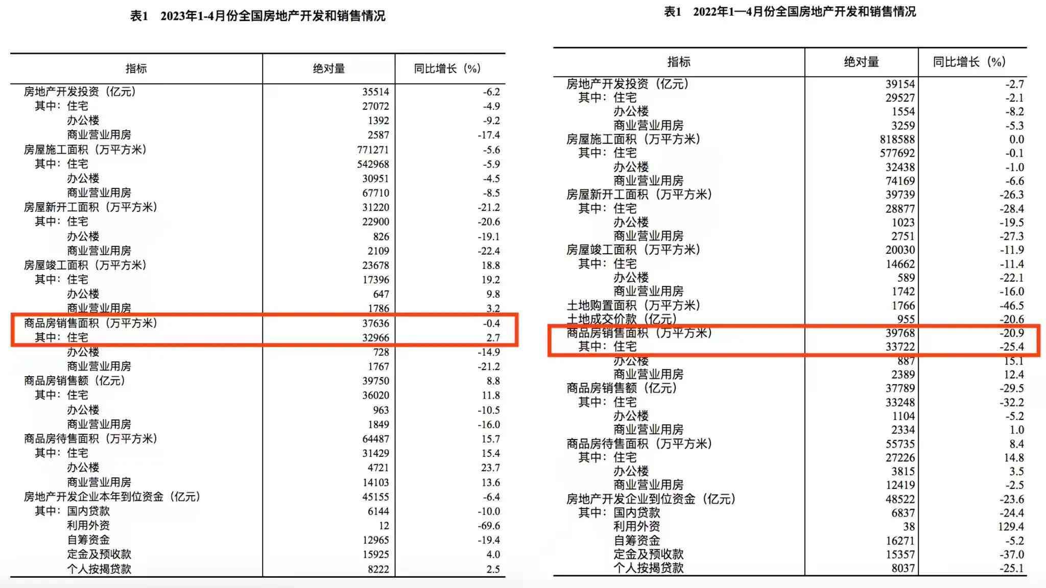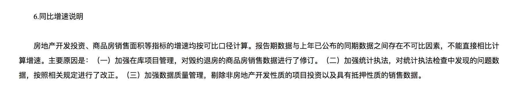 国家统计局在发布的2023年1-4月份全国房地产市场基本情况附注中解释,房地产开发投资、商品房销售面积等指标的增速均按可比口径计算。报告期数据与上年已公布的同期数据之间存在不可比因素,不能直接相比计算增速。主要原因是: