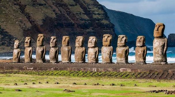 复活节岛石像,也被称为摩亚石像,是位于太平洋中的一个小岛上的巨石雕像。这些石像高达13英尺,重达40吨,远远超出了当时的岛上居民所能制造的技术水平。每个石像都有其独特的面部特征和表情,整齐地排列在岛的海岸线上。这些石像令人惊叹,并成为了复活节岛的象征。