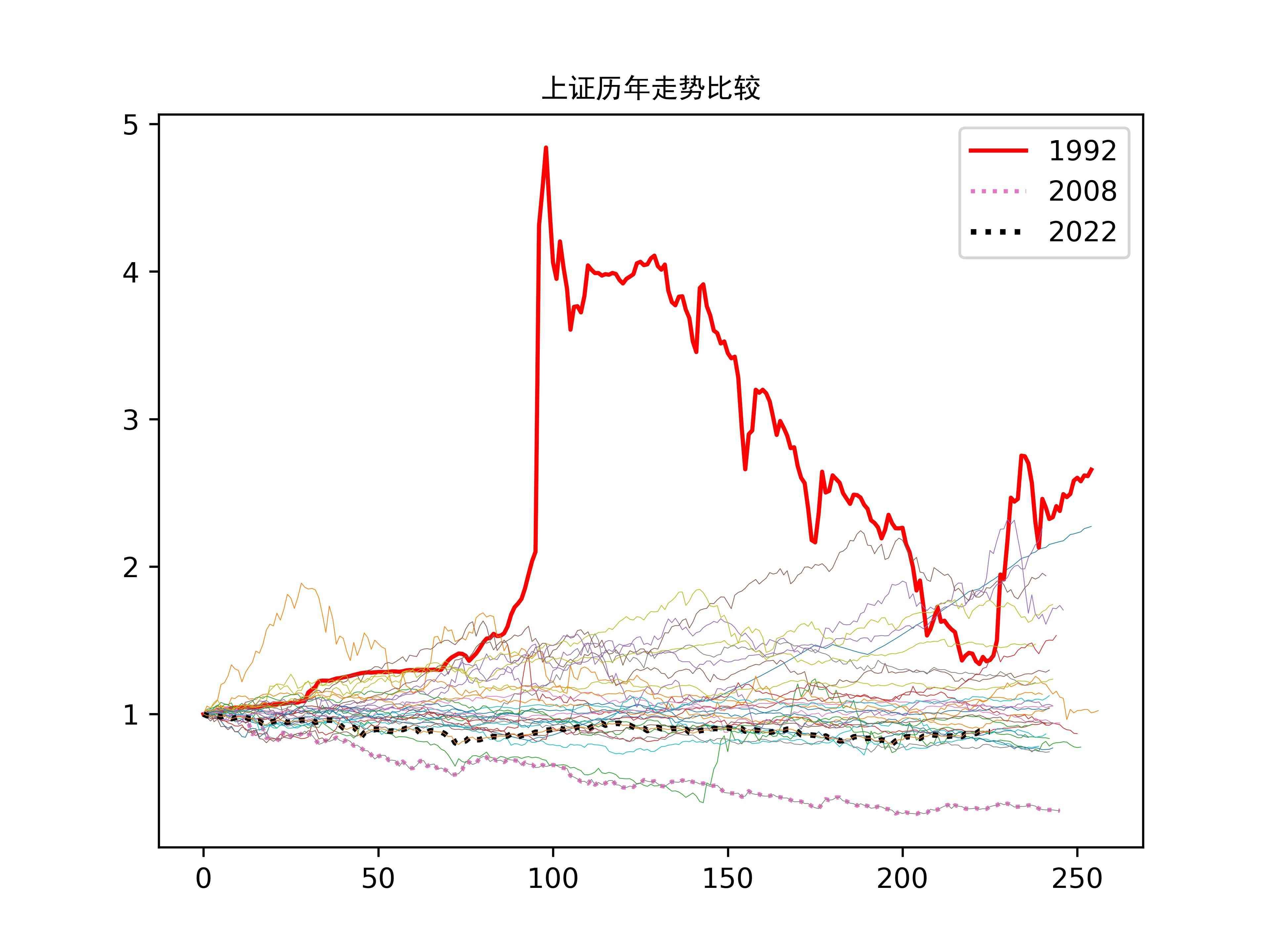 下图给出了1991年以来上证历年的走势比较,从年初到年末,1992年是走得最漂亮的,当然期间波动也挺大。
