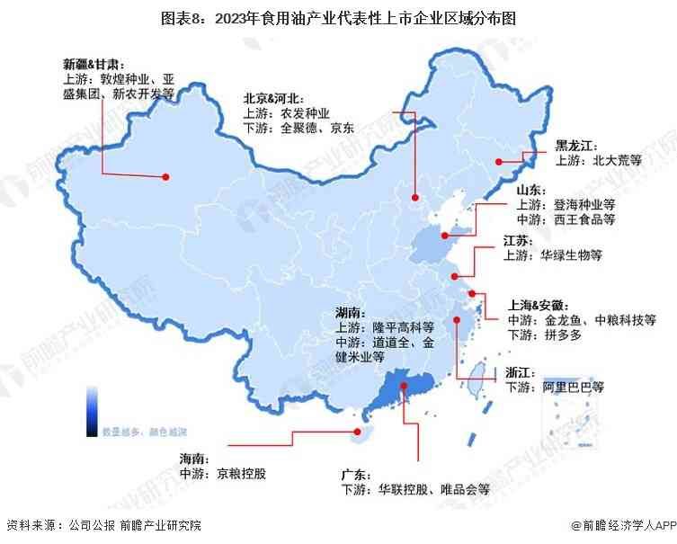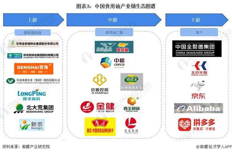 目前,我国食用油行业企业众多。其中食用油代表性生产企业包括金龙鱼、山东鲁花、上海良友、京粮控股、金健米业、西王食品、道道全、中粮科技等。上游原材料则是各类农业企业,包括敦煌种业、农发种业、登海种业、亚盛集团、隆平高科、北大荒等。下游为全聚德等餐饮企业以及京东、阿里、华联等销售渠道商。