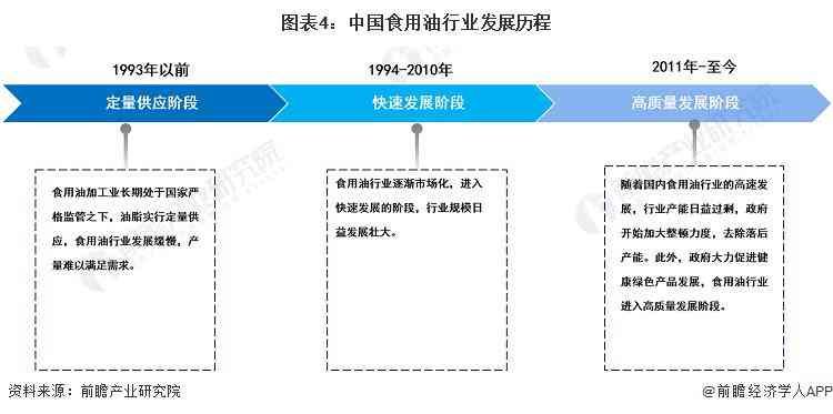 1993年以前,我国油料加工业长期处于国家严格监管之下,油脂实行定量供应,食用油行业发展缓慢,产量难以满足需求。1994年至2010年,食用油行业逐渐市场化,进入快速发展的阶段,行业规模日益发展壮大,使我国食用油加工行业跃居全球前列。随着国内食用油行业的高速发展,油脂加工业不断扩张,加之植物油融资贸易兴盛,行业产能日益过剩,食用油行业开始进入整顿、去产能阶段。2017年以来,食用油行业接连出现市场混乱现象,国家对油脂油料政策调控加强,加之国民健康消费意识不断提高,食用油行业进入高质量发展阶段。
