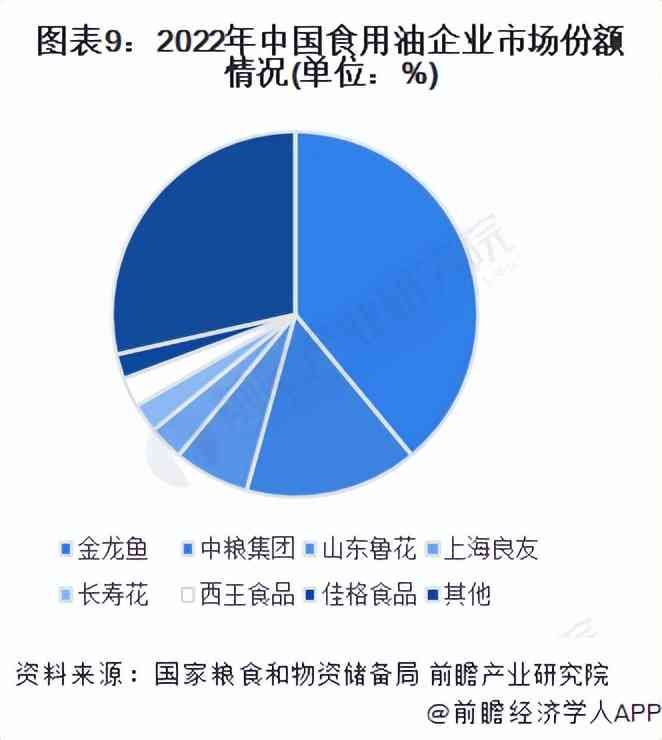 国家粮食和物资储备局数据显示,金龙鱼、中粮集团、山东鲁花、上海良友、长寿花市场规模占比分别为39.0%、15.3%、6.7%、3.1%、2.6%,位居前五。