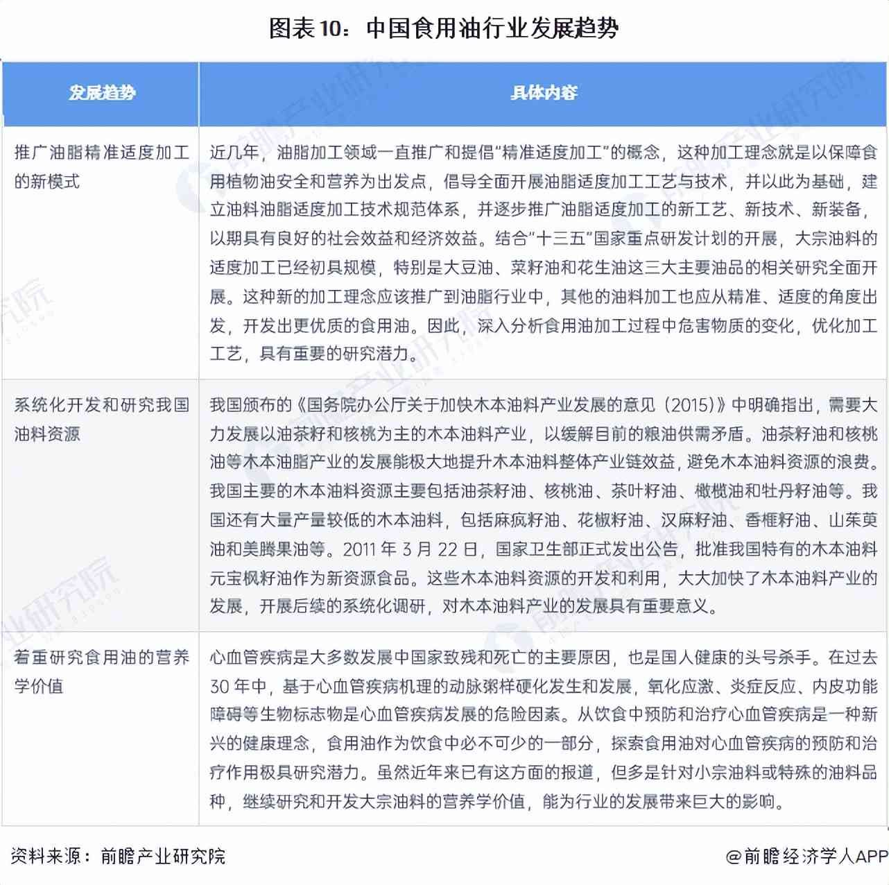 未来我国食用油行业呈现推广油脂精准适度加工的新模式、系统化开发和研究我国油料资源、着重研究食用油的营养学价值等发展趋势:
