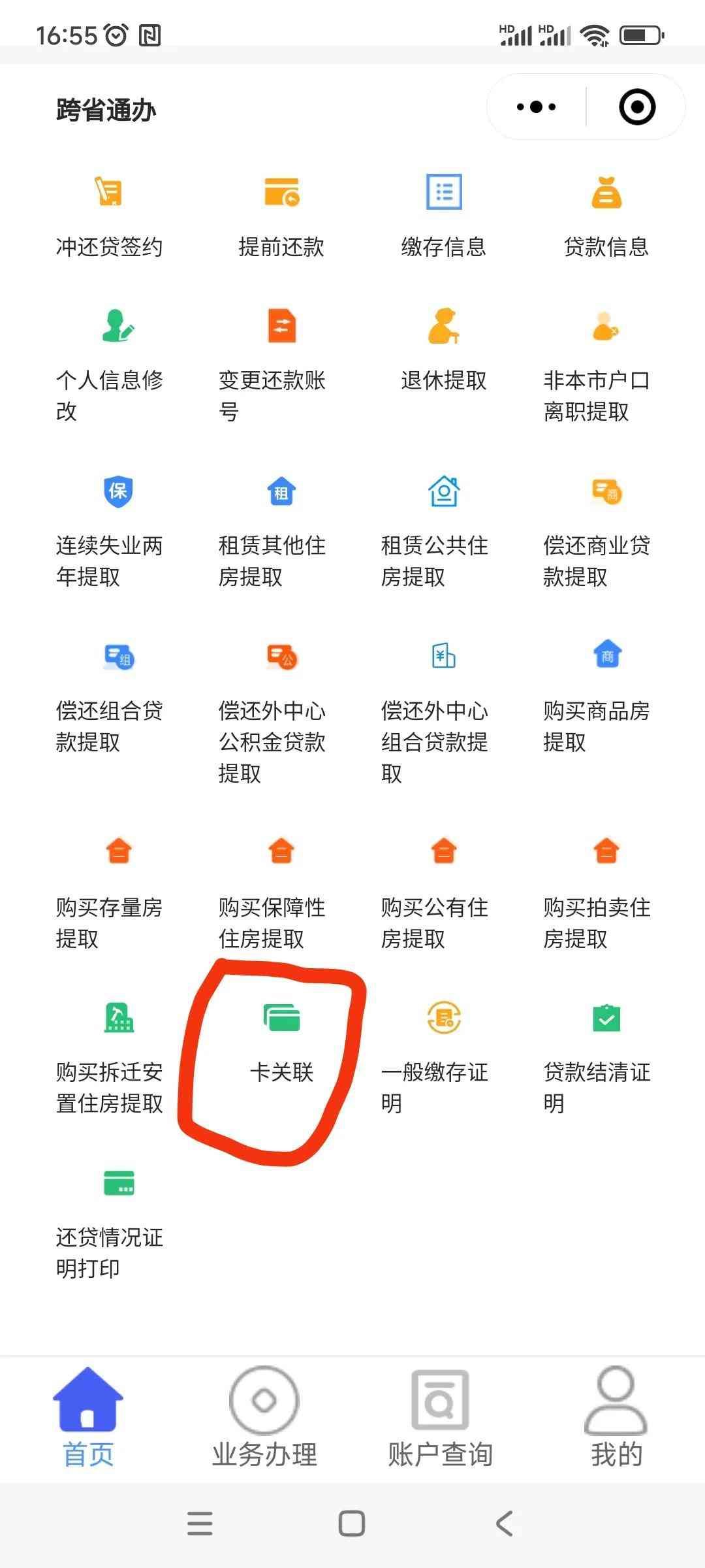 人脸识别后,点击下一步(上图) ,进入住房公积金中心首页,向下滑动,点击“卡关联”,下图红圈所示,进行绑定银行卡