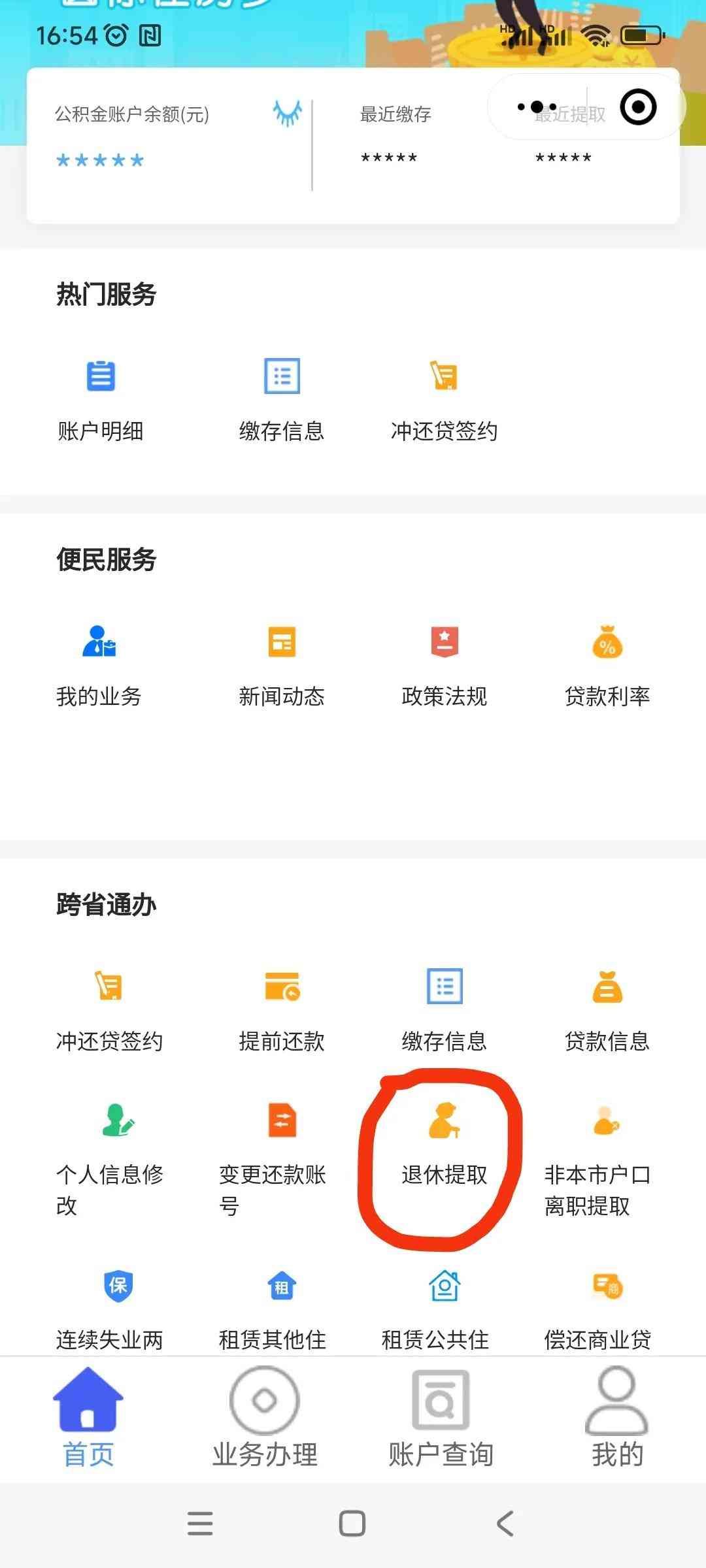 确认你的账户“封存”后,点击“退休提取”,下图红圈所示。按照提示操作,住房公积金账户全部余额就转入所绑定的银行卡中。