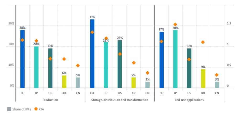 报告强调,日本在氢能领域具有创新地位,在开发和应用新技术方面具有强大优势。在终端应用领域,日本一国的专利数量是美国和韩国的总和。