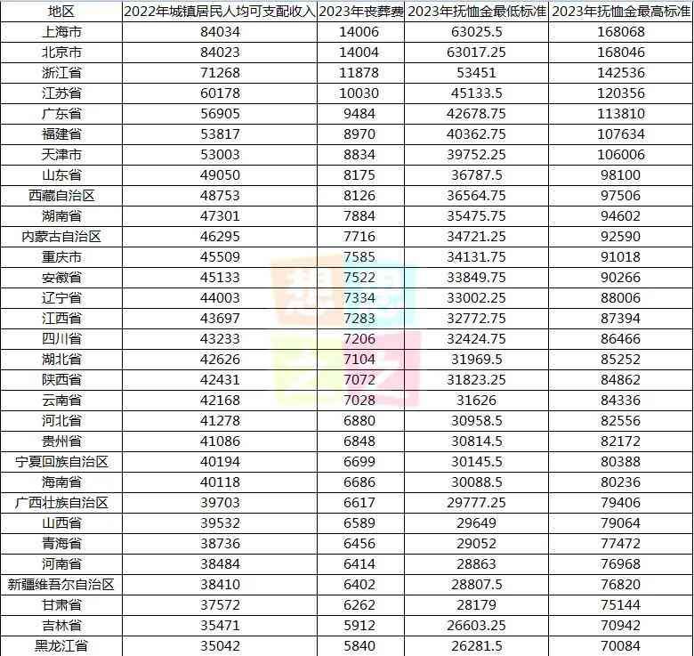 31省份2023年丧葬补助金和抚恤金标准一览