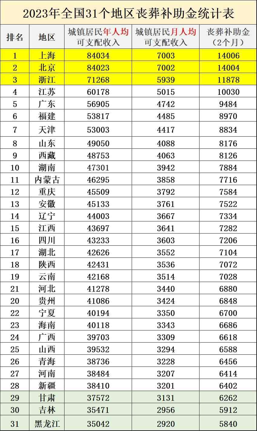 二、2023年全国31个地区,退休人员丧葬费和抚恤金标准,是多少?