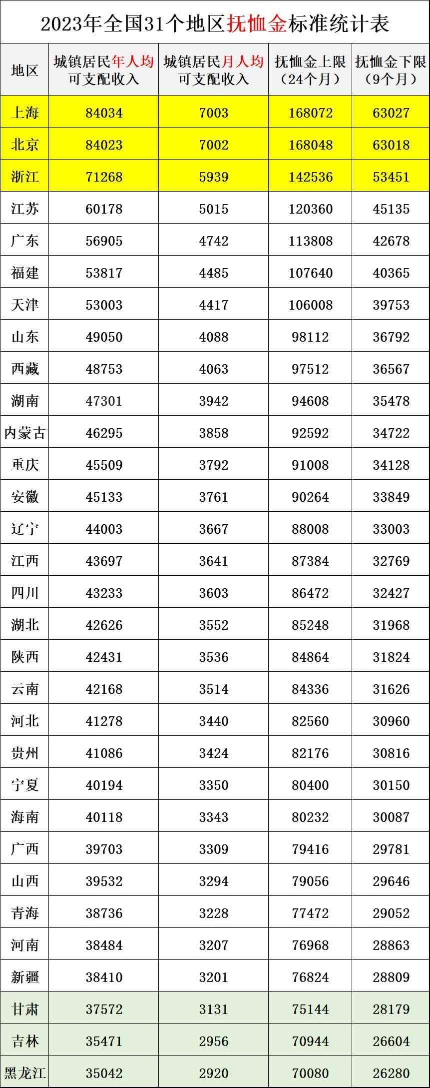 (1)排名前3位的分别是:上海、北京、浙江。抚恤金上限标准突破14万元,下限标准突破5万元。