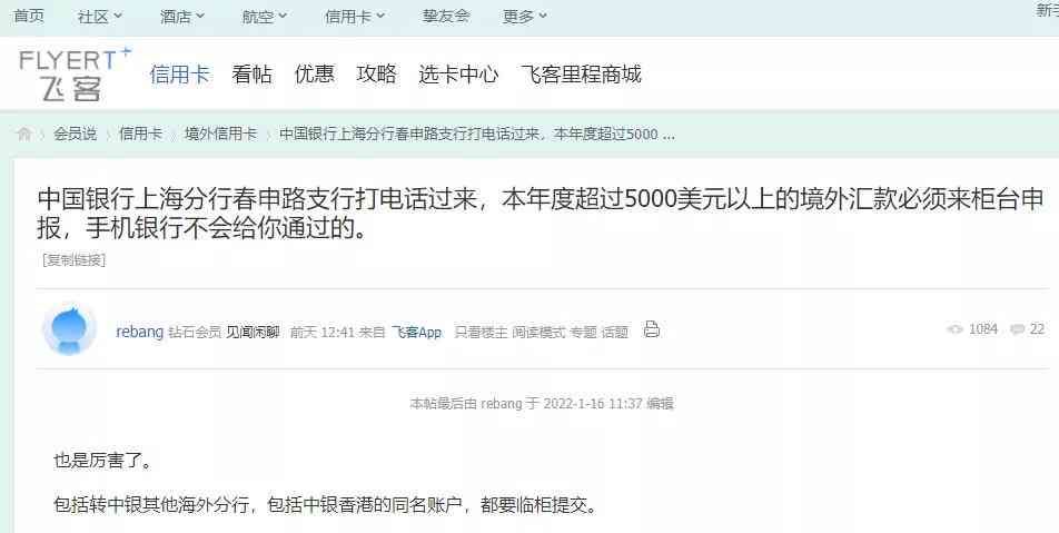 他接到了中国银行上海分行春申路支行打来的电话,大意是本年度超过5美元以上的境外汇款必须来柜台申报,手机银行不会给你通过的。
