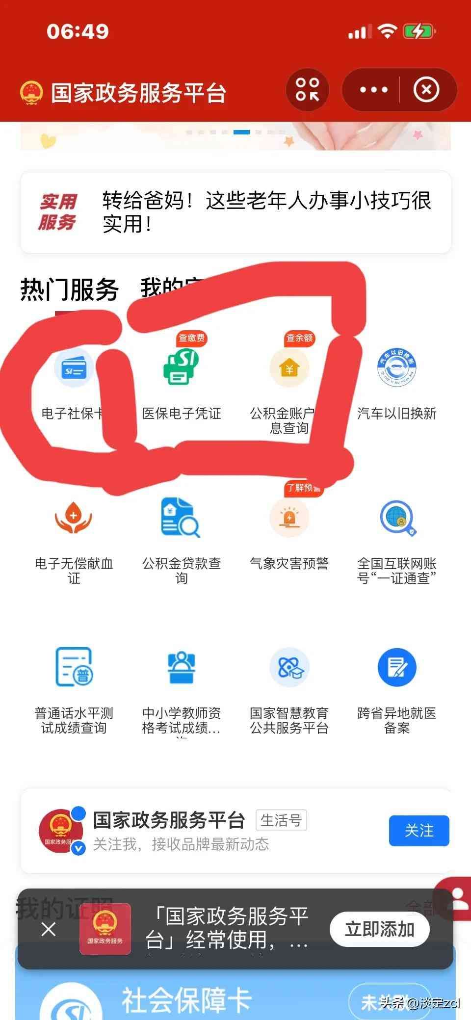 第五步:这时在热门服务,我的定制服务里就会出现社保、医保、公积金等等许多的热门服务。见上图;