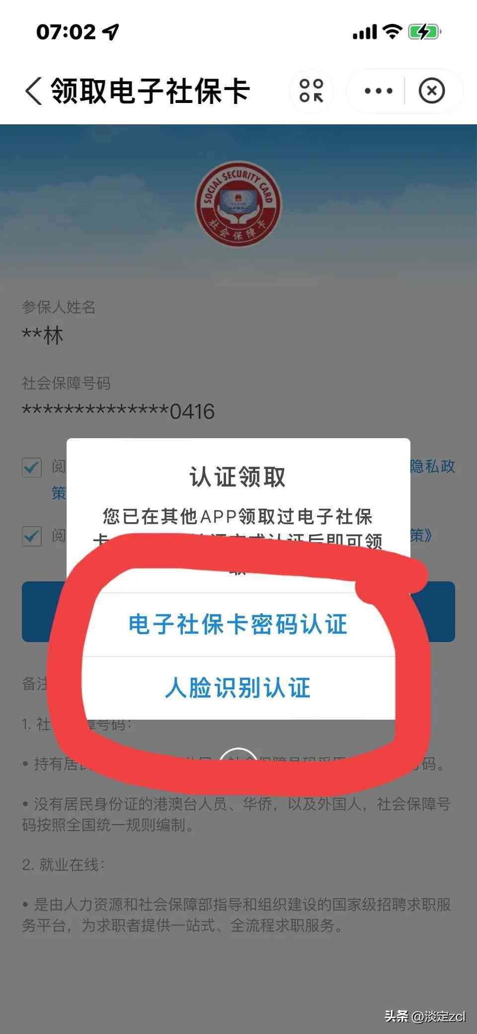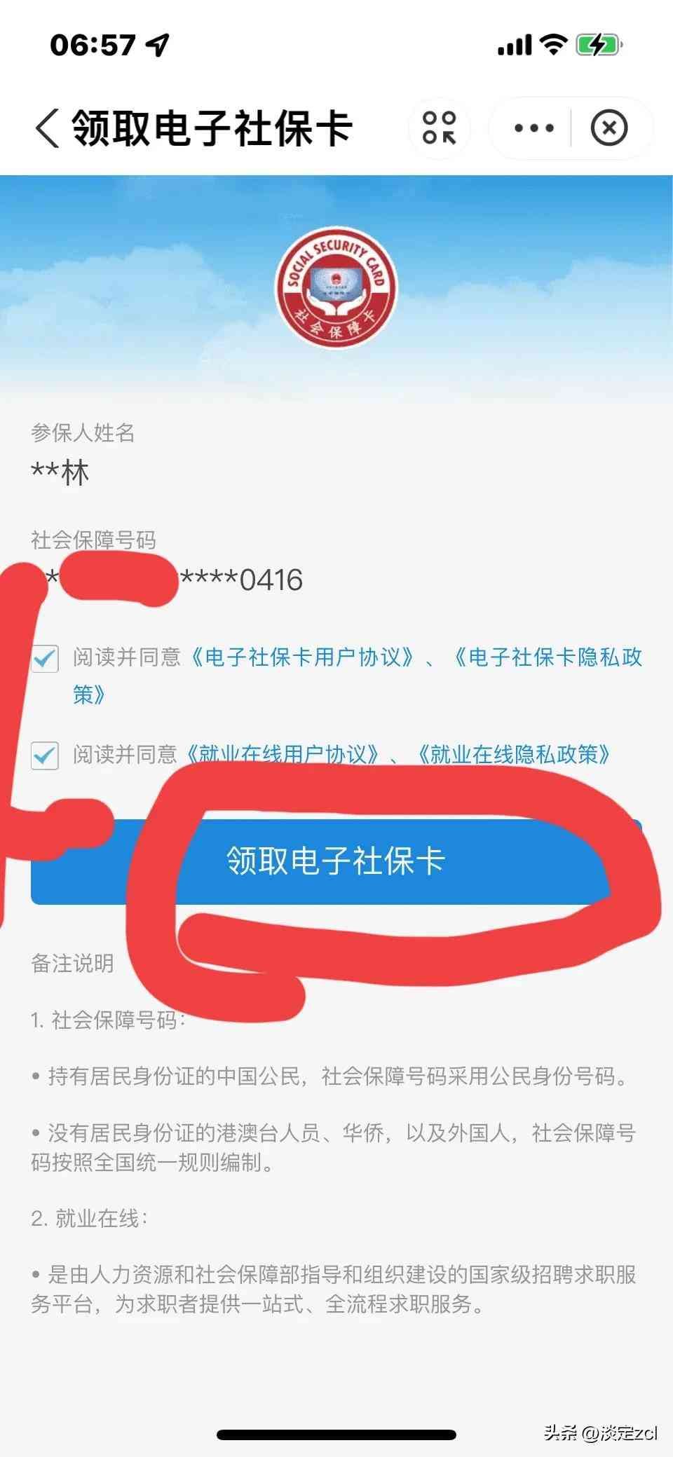 第六步:在两个阅读并同意处打上勾并点击领取电子社保卡,见上图;