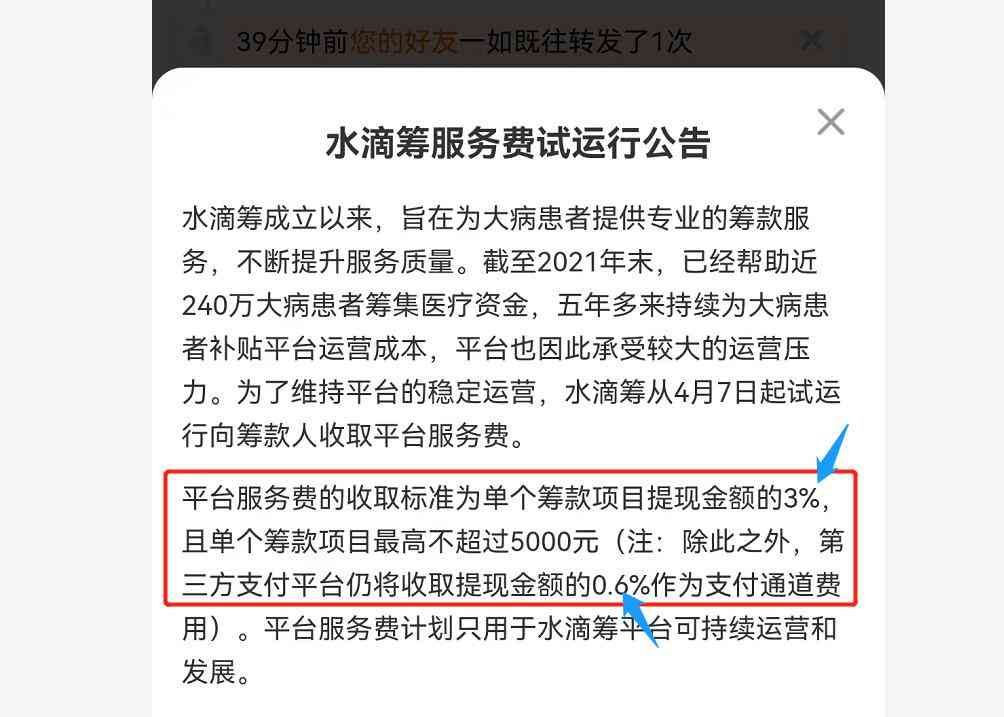 但其他平台至少都有这0.6%的提现手续费,此外水滴筹从2022年开始还增加了3%的平台提现费,患者取款的时候要从中扣除3.6%的费用。