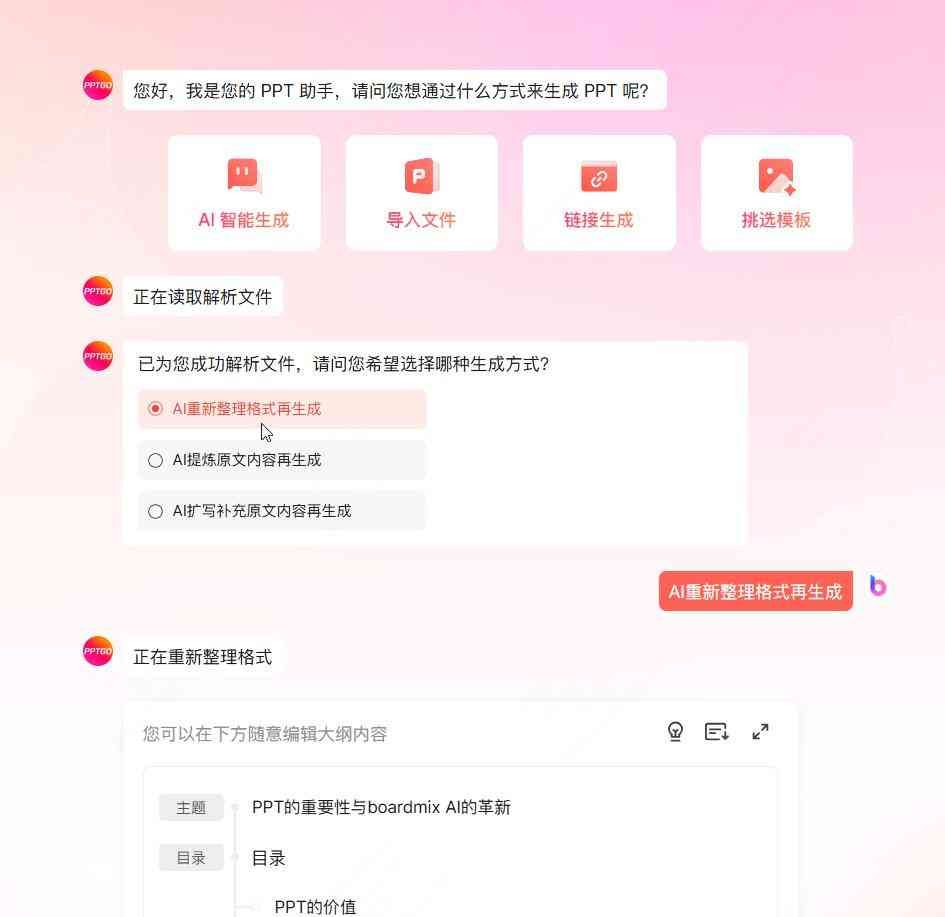 - 导入文件生成PPT:博思AIPPT将自动智能提炼生成专业的PPT,告别繁琐的排版,让你的PPT脱颖而出。支持多种文件格式,包括Word、PDF、TXT、Markdown等,满足你的不同需求。