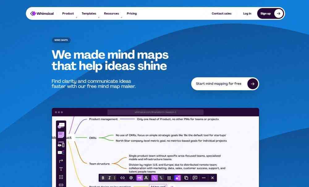 Whimsical是一款集成AI功能的智能思维导图工具,它完美结合了传统思维导图的结构化呈现方式与AI的智能化分析能力,只需输入一个导图主题,就会快速生成一份对应的思维导图。
