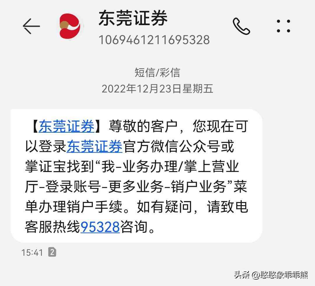二、过了半个小时左右,手机收到一条来自东莞证券的短信:尊敬的客户,您现在可以登陆东莞证券官方微信公众号或掌证宝找到“我-业务办理/掌上营业厅-登录账号-更多业务-销户业务”菜单办理销户手续。如有疑问,请致电客服热线95328咨询。