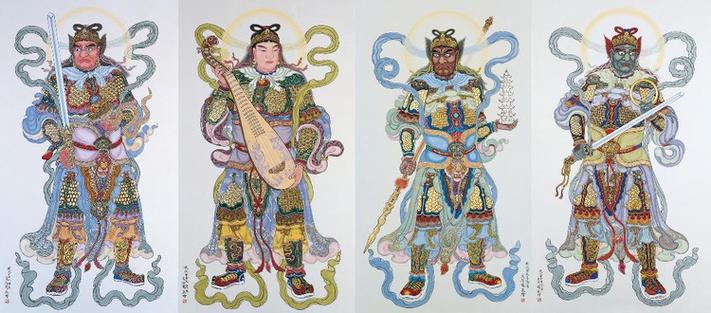 对于四大金刚手中的宝物说法也不一样。佛教传说持国天王拿琵琶,用音乐来点化众生;增长天王拿宝剑。保护佛法不受侵犯;多闻天王拿宝幡,用来引导众生,制服妖魔;广目天王拿的是绢索(捕鱼捉鸟的网),用来捕捉不信佛教的人。另外有一种说法是:宝剑代表风,因为剑舞起来能生风,昆琶代表音乐调子;伞代表雨;广目拿的不是绢索,是蜃,谐音为顺。总起来取“风调雨顺”的意思。这种说法当然有点牵强附会,但现今多数寺庙里的广目,确是握着一条似龙似蛇的东西,据说就是蜃。