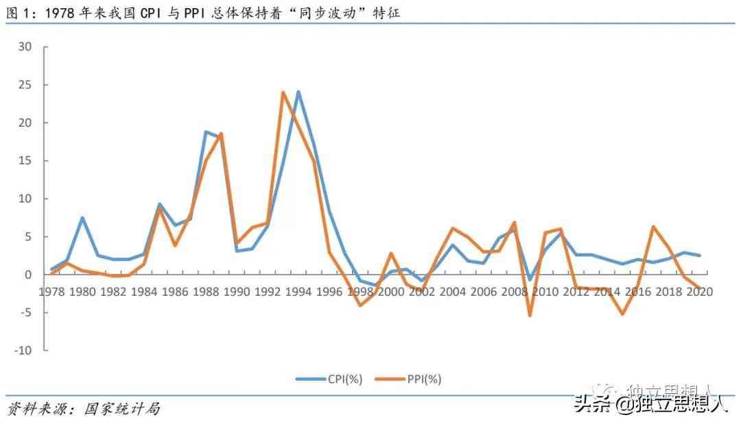 从历史大周期来看,反映下游居民消费端价格指数(CPI)与上游企业生产端价格指数(PPI)总体呈现出“同步波动”态势。这从1996年10月CPI与PPI数据同步公布以来基本验证了这一判断。尤其是,29年以前,“同步波动”特征最为明显。此后,二者的“剪刀差”时见拉大及背离现象,表现显著。