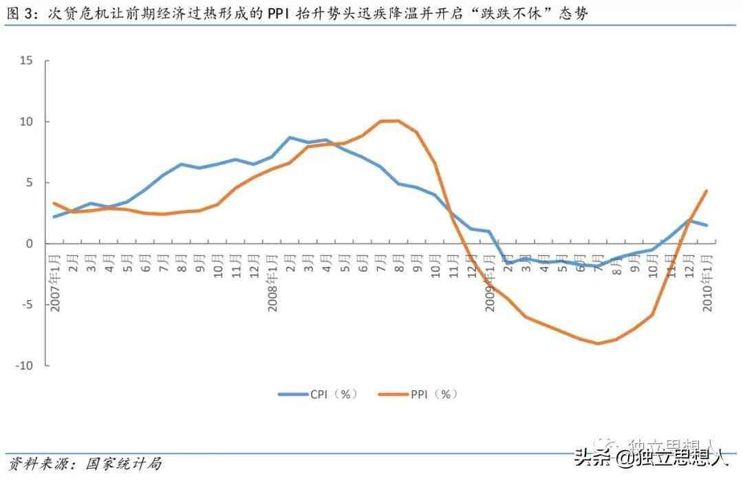 以27年水泥、电解铝等“三高”行业大爆发,带来经济过热并促成PPI一路抬升(而经由PPI传导,CPI也随之呈现了一轮上涨态势)后,当美国次贷危机爆发,进而蔓延至世界各地,并对我国经济带来强烈冲击,大量中小企业关门,生产端遭遇空前危机,终使得前期一路飙升的PPI迅疾降温,并逐月下行。直至28年中国政府推出“进一步扩大内需、促进经济平稳较快增长的十项措施”(即“4万亿”政策)出台,在此刺激和后续发力下才走出“跌跌不休”的态势。