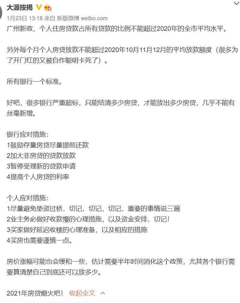 24日,有大V通过微博爆料称,“广州新政,个人住房贷款占所有贷款的比例不能超过2020年的全市平均水平。”同时,该大V爆料称,在此情况下,所有银行应对的措施是“暂停受理新的贷款申请”。