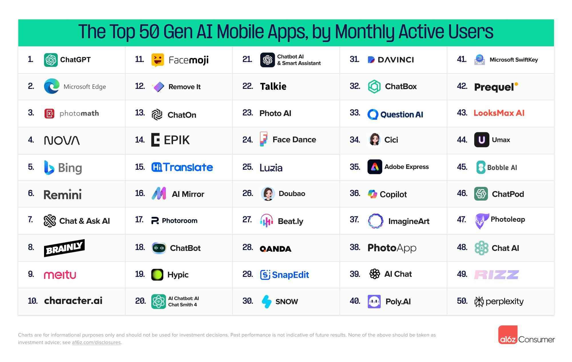 8月22日,风投机构a16z(Andreessen Horowitz)时隔半年发布了第三期《Top 1 消费级生成式AI应用》榜单。榜单分为“网页”和“移动”两个部分,字节跳动和美图公司的产品也登上了榜单,其中美图公司旗下产品“美图秀秀”在移动榜单排名第9,字节跳动“豆包”排名第26,而除豆包外,两个榜单中还出现了另外5款字节的产品。
