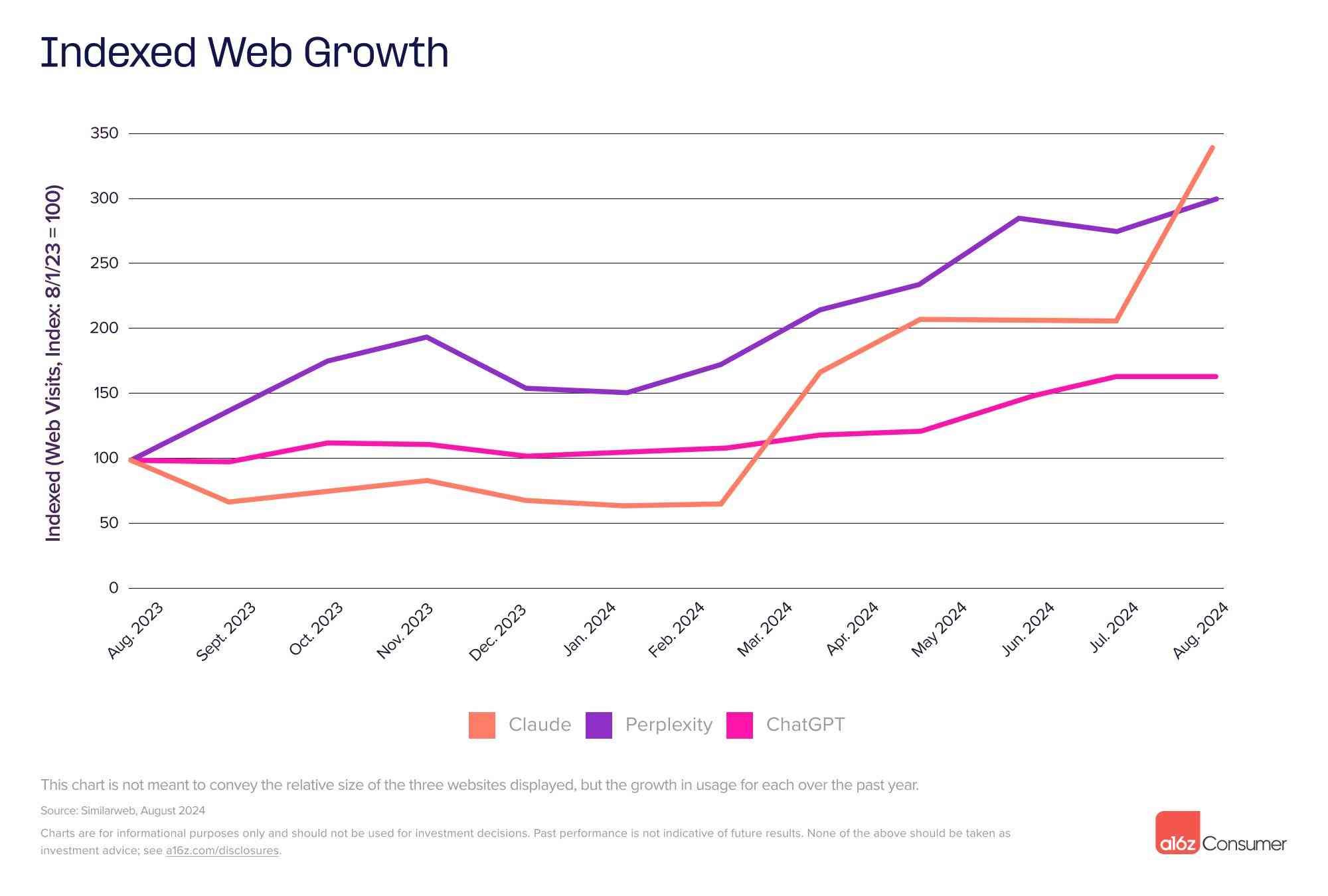 根据a16z的统计,字节跳动正在进军基于网页的AI产品领域。其三款应用首次出现在榜单上:海外教育科技平台Gauth排名第44、AI聊天机器人和应用程序编辑开发平台Coze排名第45、AI聊天智能对话问答助手豆包排名第47。