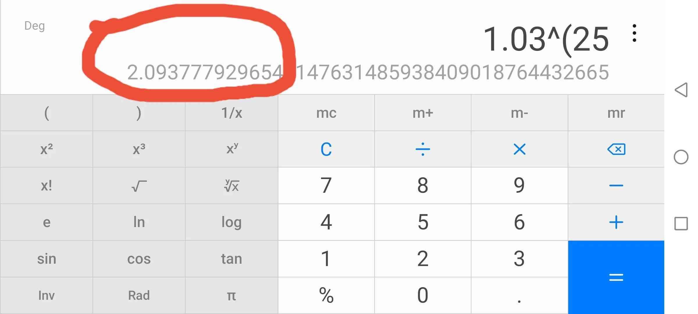 通常公式以n代表经过的年度,i代表利率。在手机计算器,例如我们求1元钱以3.%的利率,复利滚存25年的复利终值,点这个功能键计算