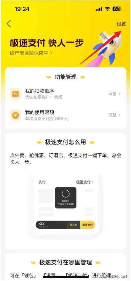 4、进入极速支付界面,点击“设置”。