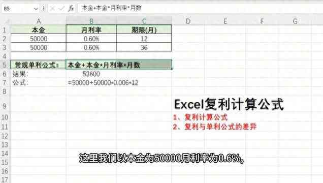 ·来看左侧的数据表,常规单利公式是通过本金加上本金乘以月利率再乘以它的月数,然后得到一个结果。这里以本金为5,月利率为0.6%,以及期限为12月来进行公式的计算,它得到的结果是536。此时通过复利的公式来进行计算,它得到的结果是53721。