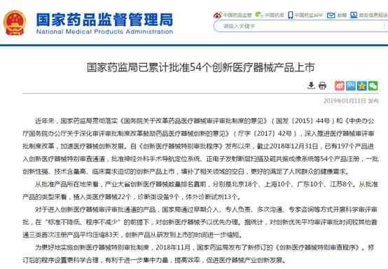 近年来,国家药监局贯彻落实《国务院关于改革药品医疗器械审评审批制度的意见》(国发〔2015〕44号)和《中央办公厅国务院办公厅关于深化审评审批制度改革鼓励药品医疗器械创新的意见》(厅字〔2017〕42号),深入推进医疗器械审评审批制度改革,加速医疗器械创新发展。自《创新医疗器械特别审批程序》发布以来,截止2018年12月31日,已有197个产品进入创新医疗器械特别审查通道,批准神经外科手术导航定位系统、正电子发射断层扫描及磁共振成像系统等54个产品注册,一批创新性强、技术含量高、临床需求迫切的创新产品上市,填补了相关领域的空白,更好的满足了人民群众的健康需求。