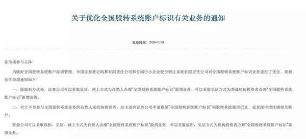 1月3日晚间,中国结算官网发布《关于优化全国股转系统账户标识有关业务的通知》(下称《通知》),明确券商可以为投资者线上办理“全国股转系统账户标识”新增业务,自2020年1月13日起可以为投资者办理“全国股转系统账户标识”取消业务。