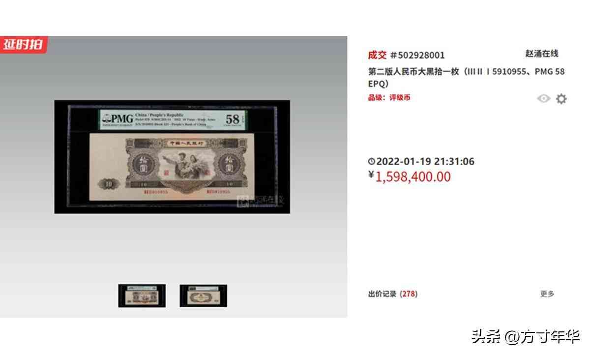 首先是这枚二版币大黑拾,58分带E,接近160万成交!即便如此,也是经过278轮的才决定花落谁家的。大黑拾的发行时间极短,由于面值、印刷等关系,目前存世量极少!